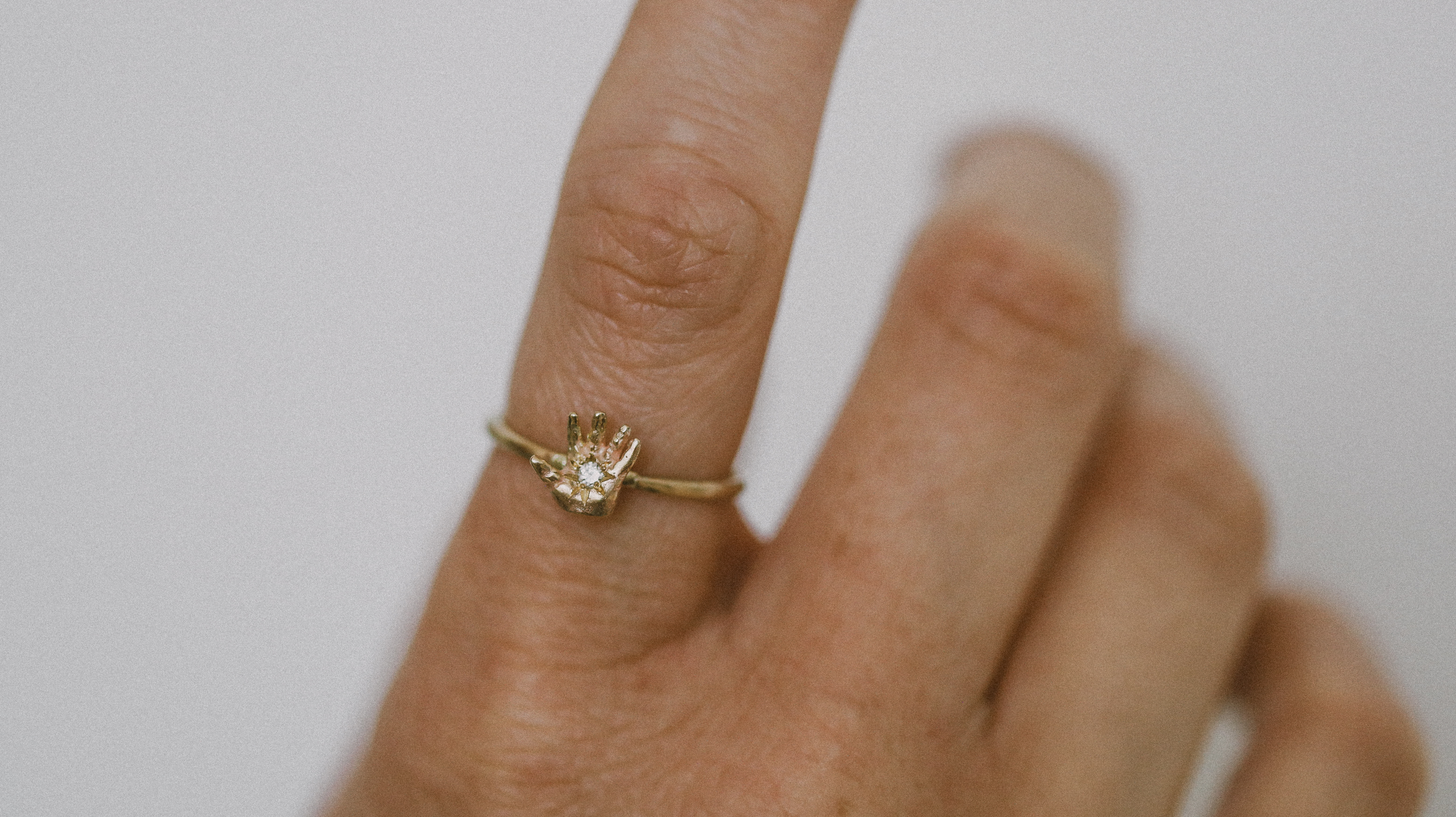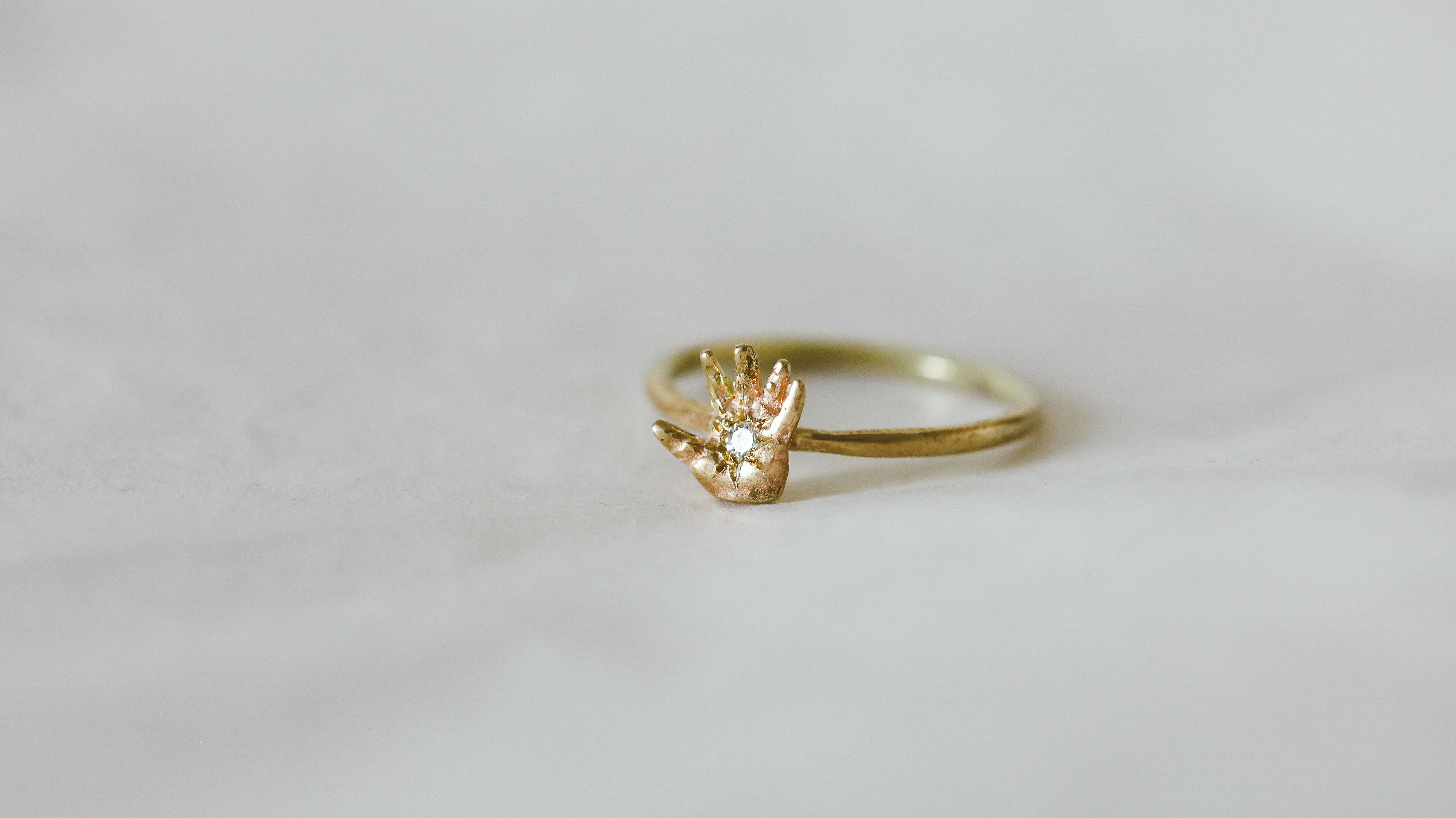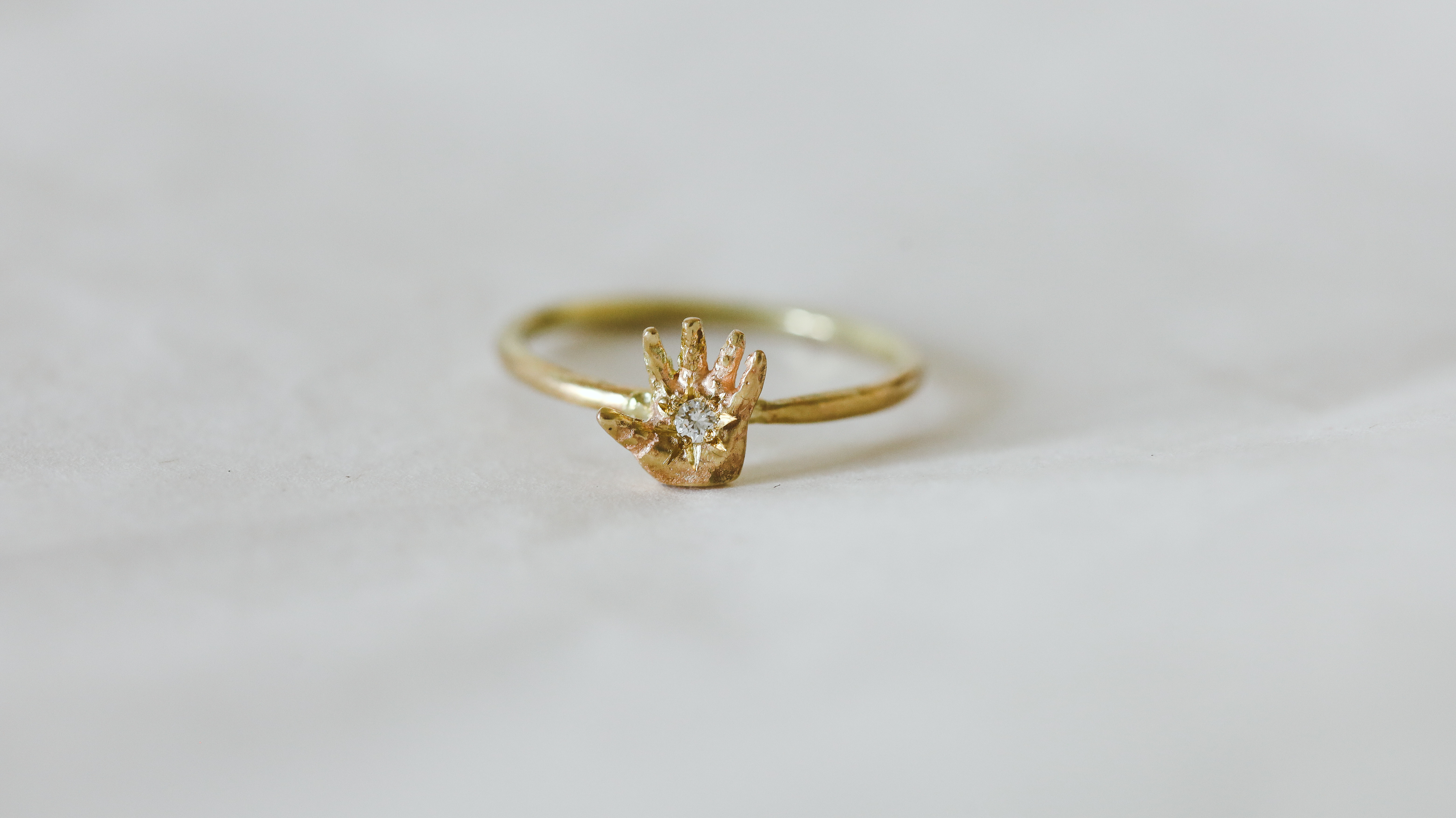 9ct yellow gold hand, stone of your choice (pictured with white diamond)